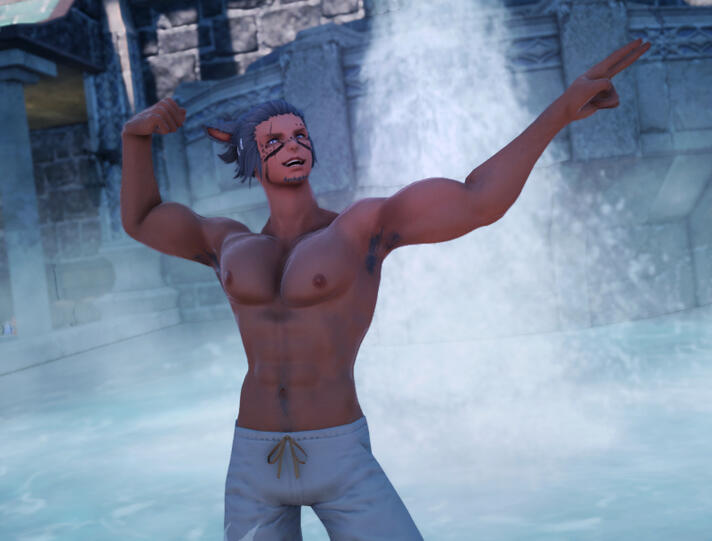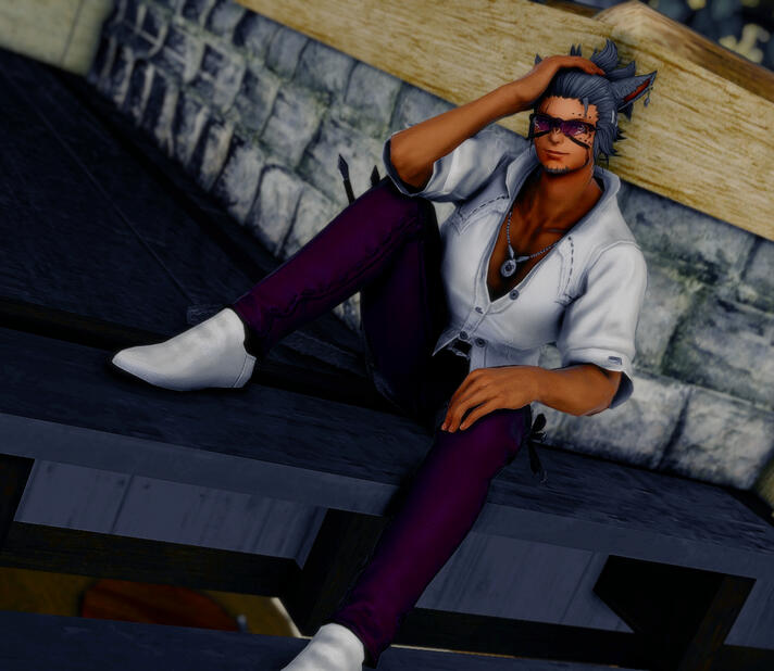 Azorr is generally happy, upbeat and fun. However, when it comes to battle, the scars run deep. He has seen what mistakes cost in a fight, and does not suffer those who do not take the responsibility of combat seriously. He has trained his body and mind, as well as honed his gifts, so that he can give his all during battle. He tries to remain calm and collected, and approaches each battle with a logical, clear mind and a vision for victory. He is able to think on his feet if necessary. Those who follow his orders find success. However, those under his command who don't, find that discipline from Azorr is swift and unforgiving. When lives are on the line, Azorr would rather instil into someone through punishment how important it is before there is a mistake, than try to seek forgivness after there has been one.Outside of his duties as a mercenary, however, Azorr is fun but responsible. He enjoys both social outings and gatherings, and quite times either alone or with small groups of companions. He has difficulties with interpersonal relationships, as his social upbringing was never the best, even when he was finally taken in by mentor Kori and the mercenary band and taught social etiquette.Azorr's years in the desert wastelands have pushed him to have an enjoyment of water, and he will be seen frequently around places with recreations involving water. He makes his primary home in the Mists of Limsa, right by the beach, and has multiple baths in his home for this reason.Although he has drifted from his culture and heritage, Azorr continues to at least honor some traditions. Renaming himself "Azorr Kori", dropping the title of either "Tia" or "Nunh" from his name, he acknowledged that he is no longer part of his tribe. He took the name of his mentor, Kori, and has used it since.He is polyamorous, though currently in a monogamous relationship and happy with it. He does have a tendency to show his feral side more during times of high emotion. He also suffers from PTSD from his traumas, resulting in a severe anxiety disorder at times which causes social issues.Azorr is fiercely loyal to friends, and quick to defend those he feels need defending. His sense of justice is strong, and he will stand up for what he feels is right, sometimes going too far and refusing to back down when he should. His lack of fear and full dedication to his beliefs do not sit well with others, which adds to his social awkwardness.